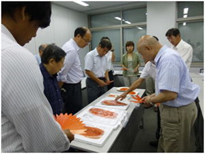 プレミアムヤシオマスの7つの基準をクリアした高品質な魚だけを流通させるため、品質検査を行っています。